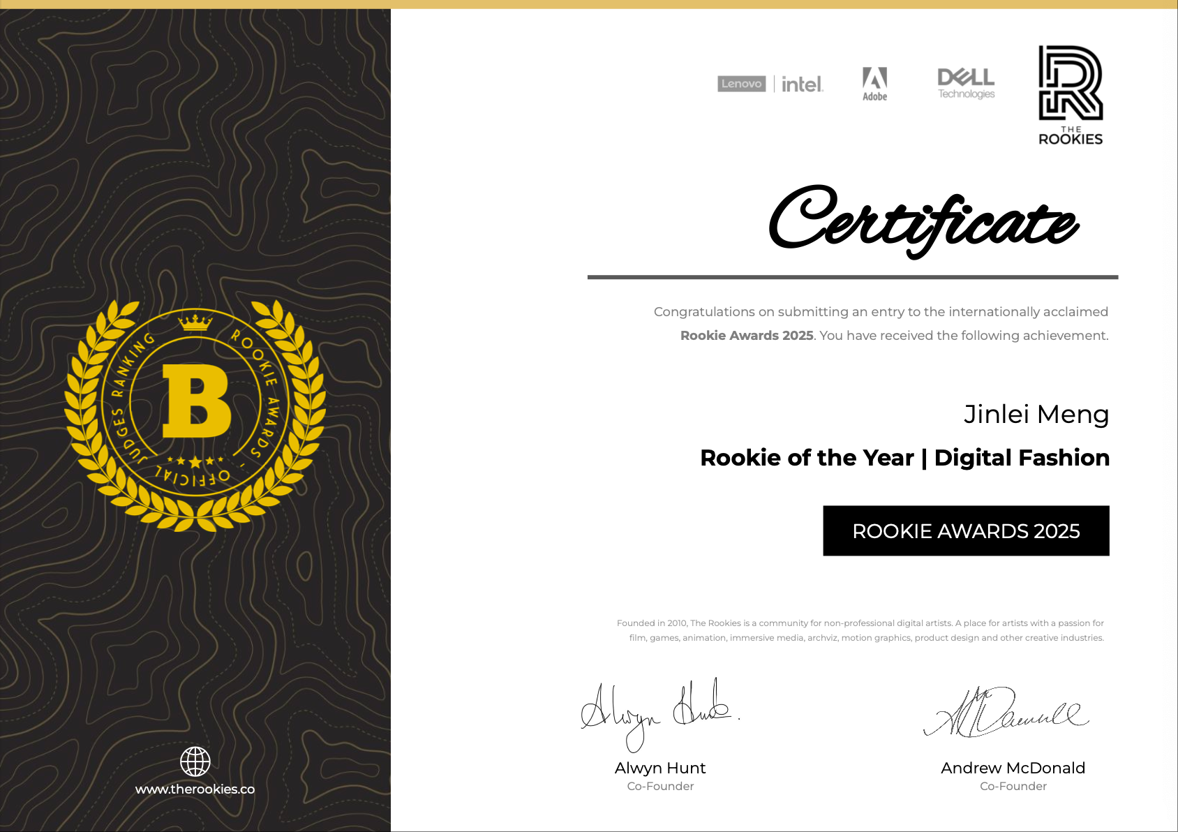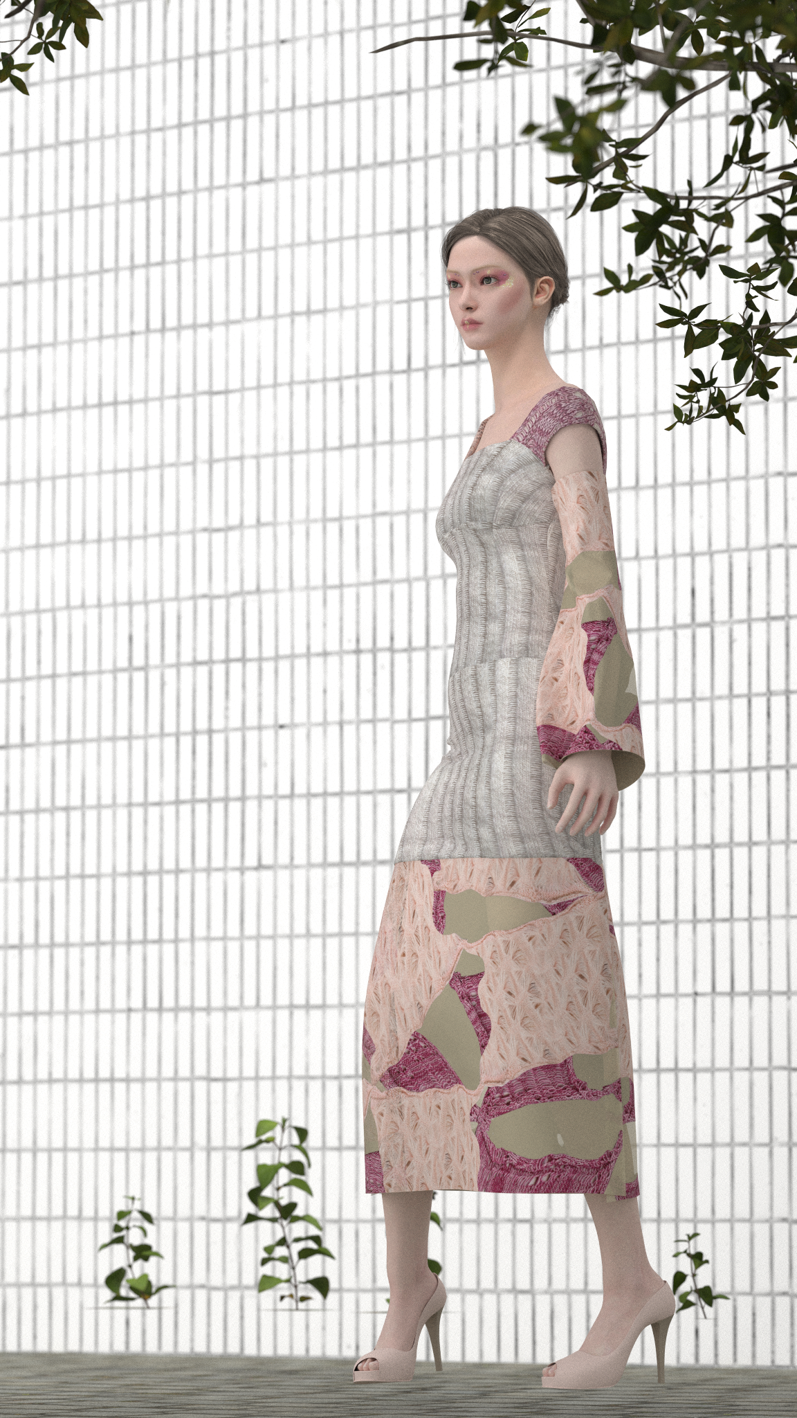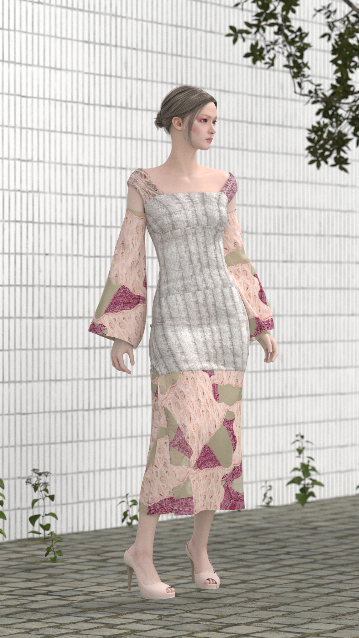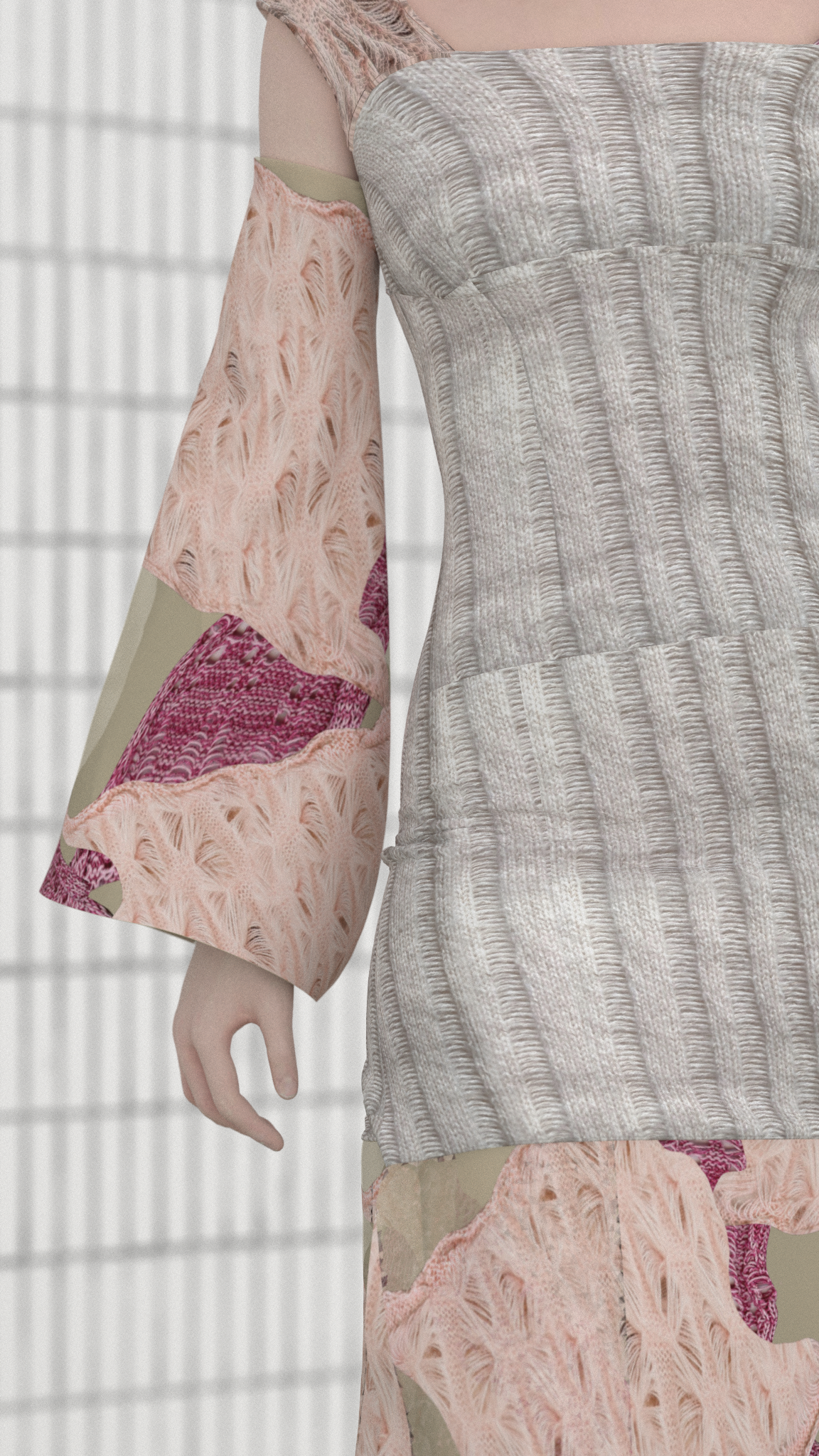 Look 6 was developed using CLO 3D to visualize the final garment. In this part, I focused on integrating my own hand-knit swatches into the digital model to accurately represent the texture and structure. The design highlights the contrast between power mesh and knit — softness and tension, transparency and density. I also styled the model and applied makeup to reflect the mood of the collection, bridging the technical process with a complete visual identity. This project was also recognized with the Rookie Awards 2025 – Industry Ranking Certificate Grade B.